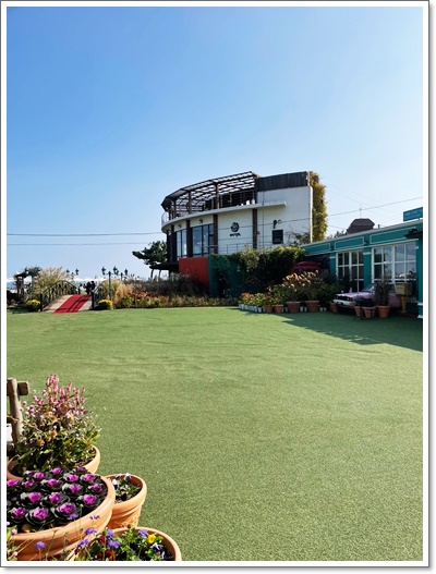 여기는 오션뷰 맛집으로도 굉장히 유명한데요 날씨만 좋다면 어디든 안 좋겠냐만은 여기서는 정말 최고의 풍경을 보실 수 있습니다 푸른 하늘과 초록빛 잔디밭 그리고 시원하게 펼쳐진 바다가 한눈에 보이는 그야말로 환상적인 전망을 자랑하죠 건물도 크고 야외 공간도 넓어서 아이들은 물론이고 어른들도 좋아할 만한 공간이에요 저희는 야외에서 먹다 갑자기 바람이 부니 쌀쌀해서 바다정원 내부로 들어왔습니다 다행히 사람이 많이 없어서 편안하게 수다를 떨었는데요