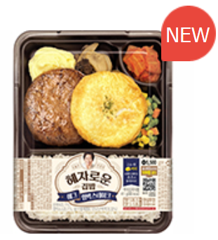 에그함박은 가성비 높다는 혜자 도시락에 걸맞게 우육과 돈육의 함량을 높여 지름 약 10cm 정도의 큰 사이즈 함박스테이크가 메인반찬으로 들어가 있으며 반숙프라이가 곁들여져 좀 더 촉촉하게 맛볼 수 있다고 합니다 그 외에 모둠버섯, 모둠야채구이, 매쉬드포테이토, 볶음김치와 백미밥으로 구성되어 있습니다 또한 포션버터가 첨부되어 있어 전자레인지에 돌린 후 버터를 함박스테이크 위에 바르면 더욱 고소한 풍미를 느낄 수 있다고 합니다